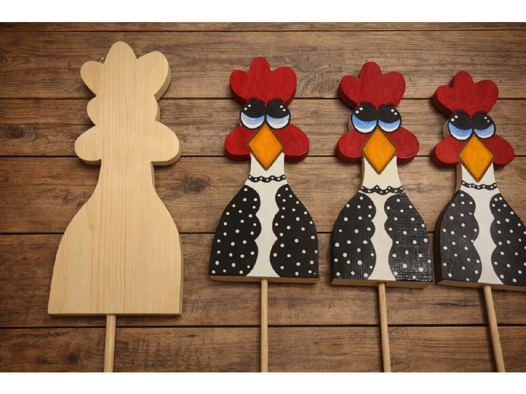 Dřevěné polotovary na podstavci-tvary různé Velikonoční výřezy k dotvoření Slepička čumilka-polotovar k dotvoření